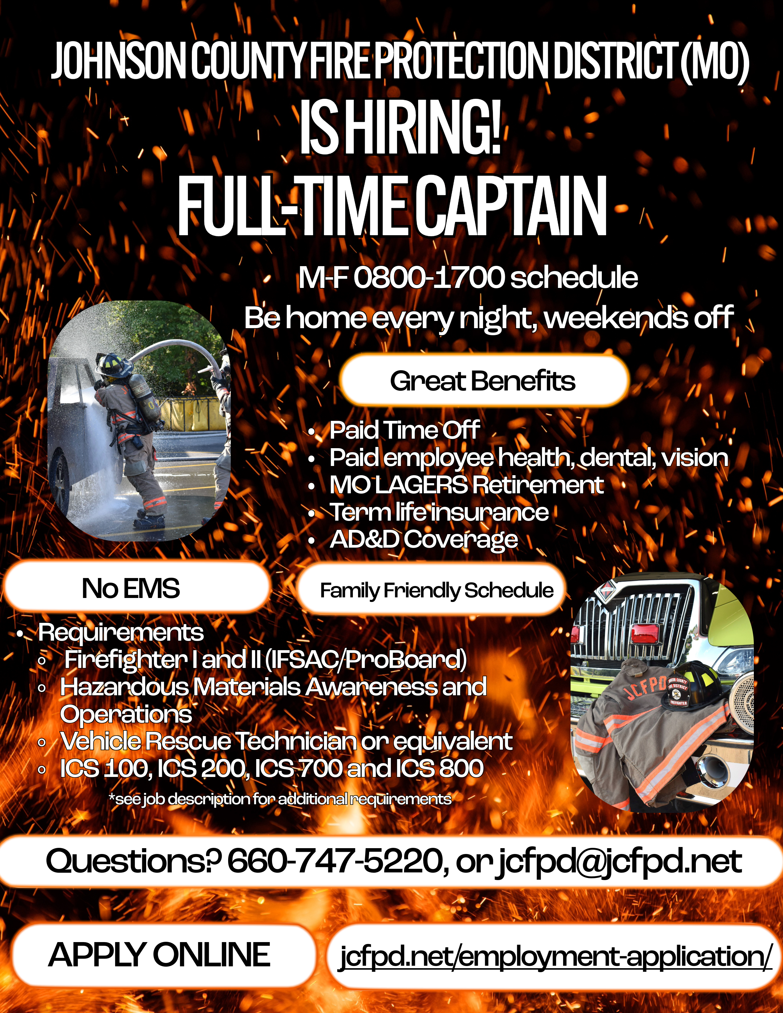 - Residency in the boundaries of the Johnson County Fire Protection District or within a reasonable distance from the boundaries within 180 days of hire, is preferred but not required. Any variance must be approved by the Fire Chief.